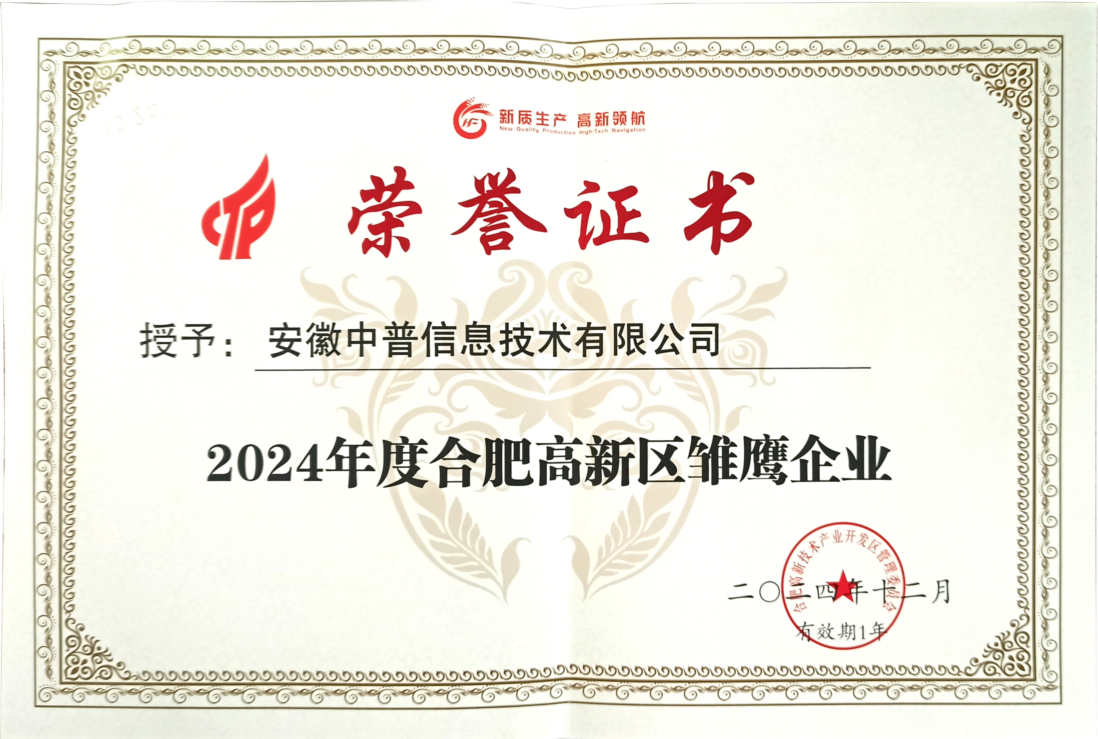 近日,安徽中普信息技術(shù)有限公司憑借在技術(shù)創(chuàng)新、產(chǎn)品研發(fā)以及市場潛力等方面的卓越表現(xiàn),在眾多參評企業(yè)中脫穎而出,榮獲“2024年度合肥高新區(qū)雛鷹企業(yè)”榮譽證書。