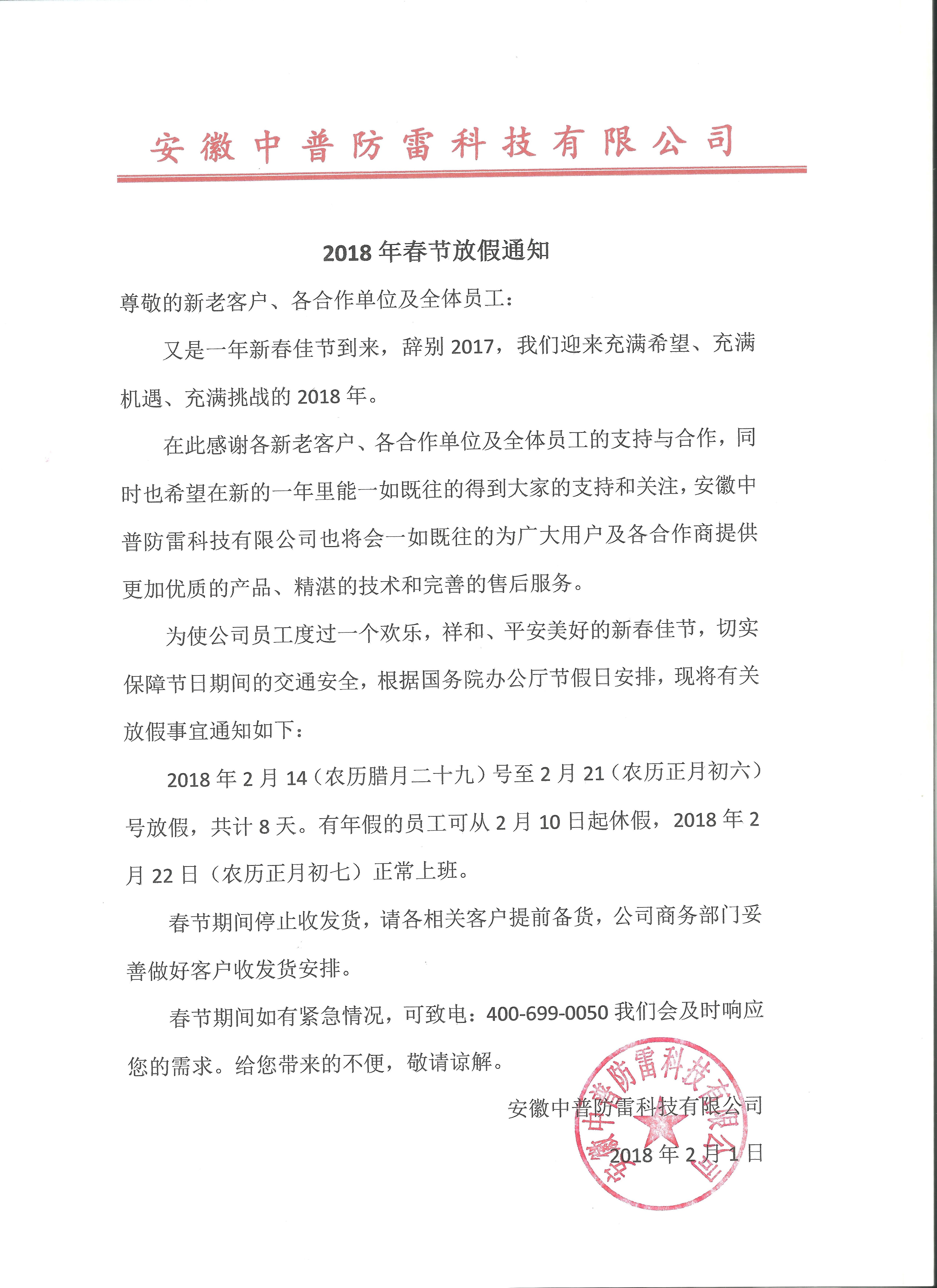 安徽中普防雷“關(guān)于2018年春節(jié)放假通知”