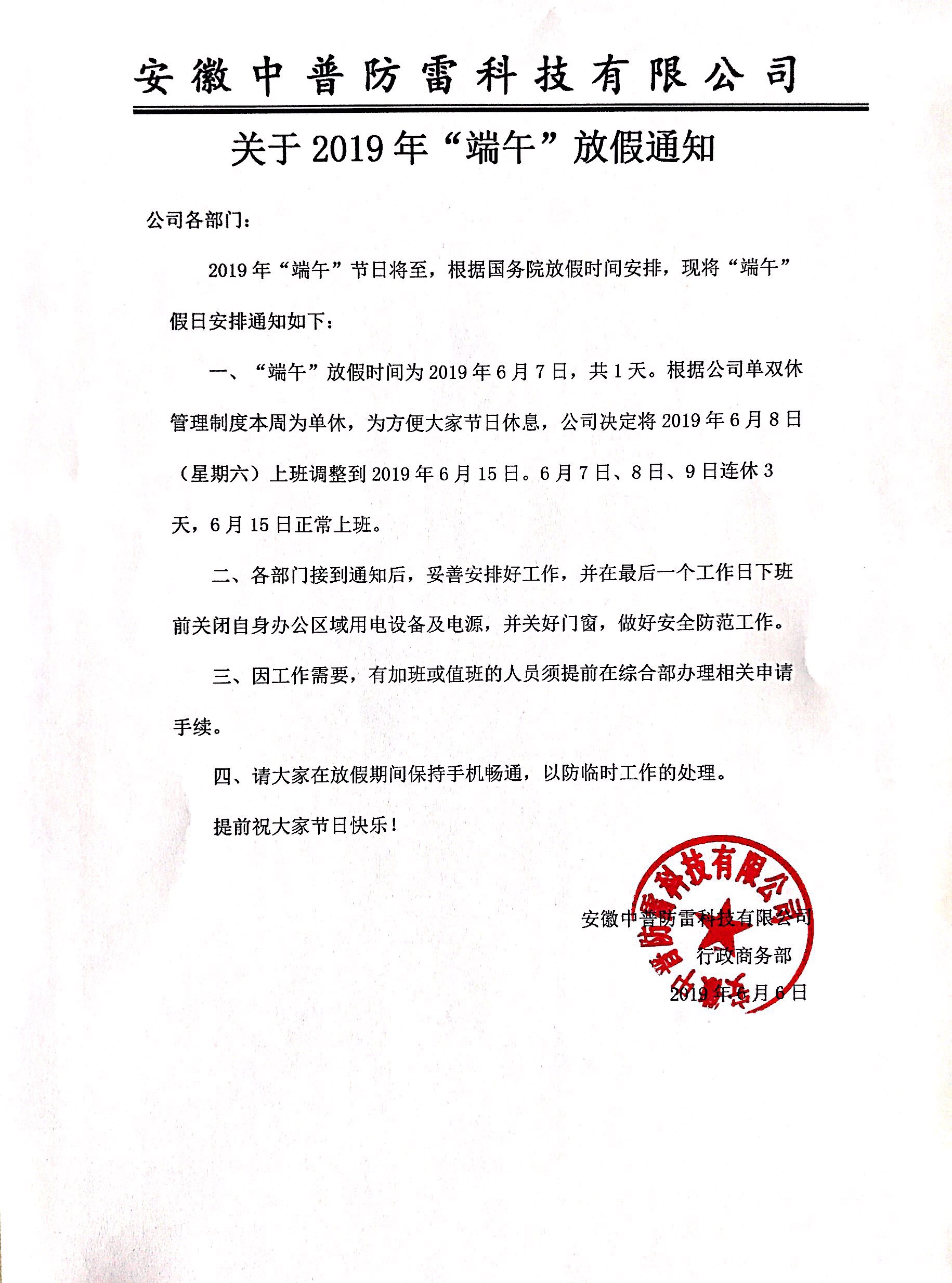 安徽中普防雷“關(guān)于2019年端午節(jié)放假通知”