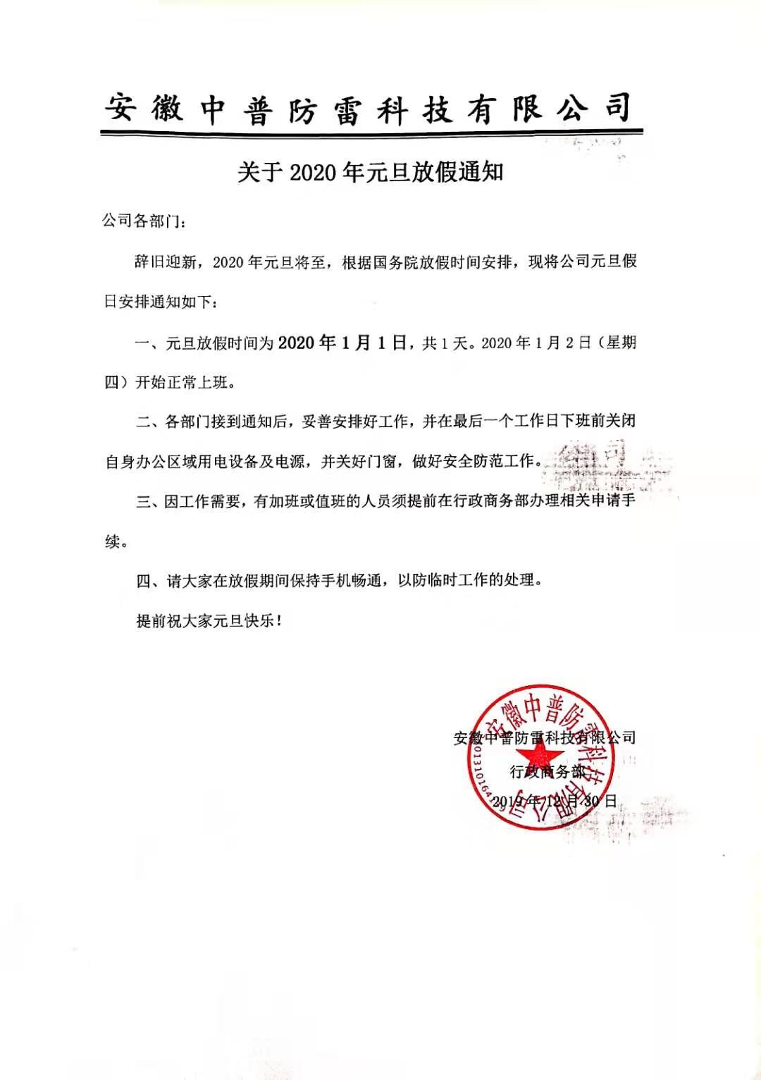 安徽中普防雷“關(guān)于2020年元旦放假通知”