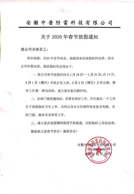 安徽中普防雷“關于2020年春節(jié)放假通知”