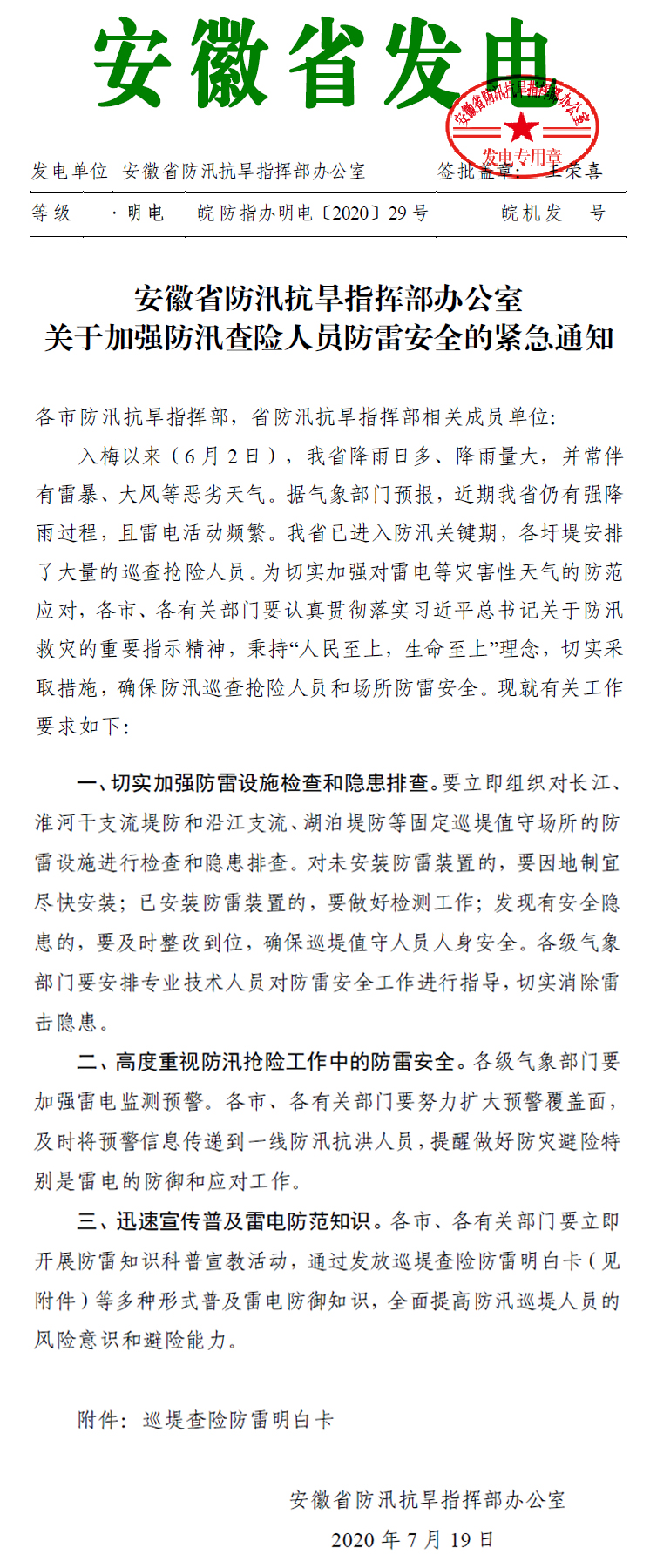 通知要求各市、各有關(guān)部門(mén)切實(shí)采取措施,確保防汛巡查搶險(xiǎn)人員和場(chǎng)所防雷安全。